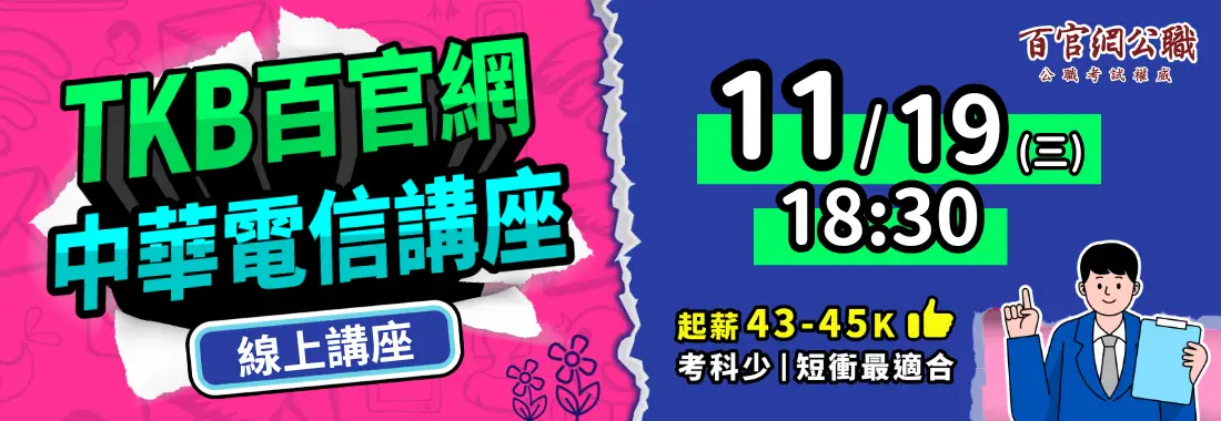 業務類起薪43K、技術類45K 討論度最高!薪資福利最香! 中華電信短衝上榜,就來TKB百官網 【TKB百官網】將於11/19舉辦中華電信線上講座,針對中華電信發展趨勢、考試必注意的重點,還有分享TKB百官網學長姐的中華電信上榜關鍵,想搶下中華電信招考名額?TKB百官網【中華電信線上講座】千萬不可錯過! |